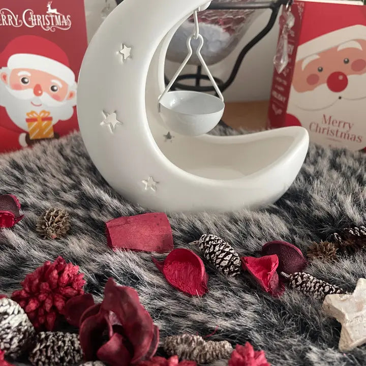 Its pure white ceramic design, shaped like a crescent moon with delicate cut-out stars, blends beautifully with any décor. The hanging bowl, also in white, gently swings over the candle, melting your wax to release its fragrance subtly and steadily. 🕯️✨